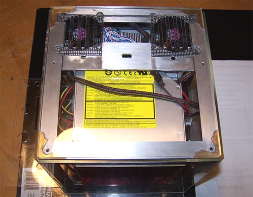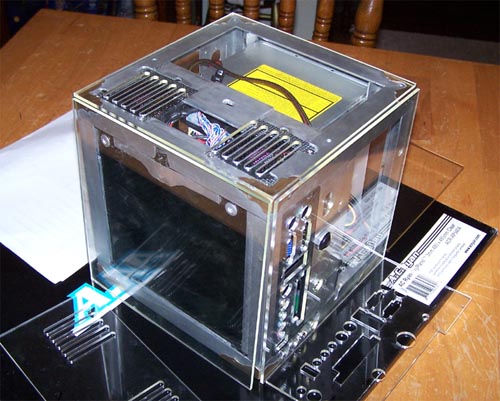 After thinking over the past couple months about this mod I decided there was a need to simple things up and there are a few reasons why. I planned the internal part of this mod really well, but had no plan for attaching the outer acrylic panels... the method I have come up with does not allow for the side mounted hard drive since it attaches directly to the corner angle. The hard drive that was removed would have had questionable ventilation to it's underside anyway, with a single drive mounted to the openly vented case bottom the top fans become unnecessary... color them gone. I wanted to lighten the load to the power supply so that the 6" LCD could lose the external 12V power adapter and run PSU direct, so the HDD, both fans, the pinhole camera (a novelty that would have been lost in a sea of novelty) and the TV tuner card + IR receiver (piece of crunk) have all been removed.