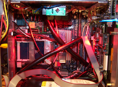 - Home - Mod Guides - Work Logs - Articles - Work Log Page: [1] - [2] - [3] - [4] - [5] - [6] Time to crack the whip... Update 06/26/2006 The flat ribbon IDE cables I had intended using looked unsightly inside the case and covered up too much of the motherboard. There was no good way to fold them out of the way so I scrapped them in favor of the black rounded IDE cables shown below. I removed the paper tabs and the boots from the ends